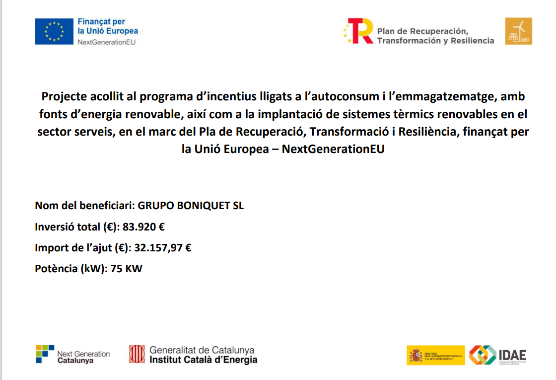 GRUPO BONIQUET SL, siguiendo estas bases, con fecha 22/03/2022 hizo la solicitud para el Programa de incentivos ligados al autoconsumo y almacenaje, con fuentes de energía renovable e implantación de sistemas térmicos renovables y de acuerdo con la propuesta de resolución de otorgamiento de fecha 15/07/2025, se ha otorgado a GRUPO BONIQUET SL la cantidad de 32.157,94€.